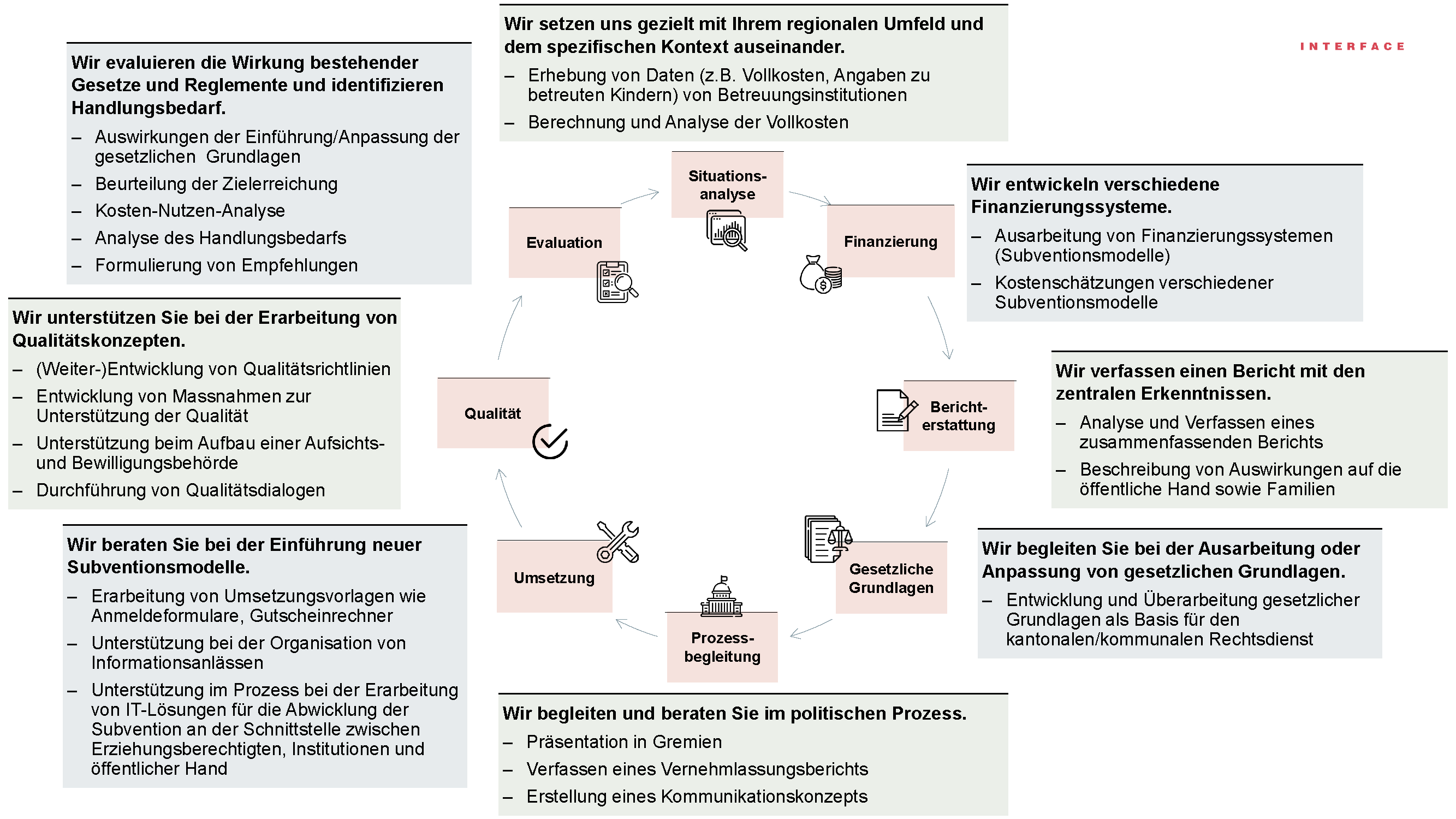 Interface unterstützt Kantone, Städte und Gemeinden bei der Entwicklung und Umsetzung der familien- und schulergänzenden Kinderbetreuung.